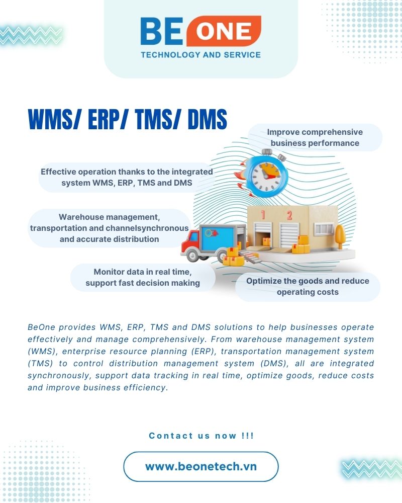 In the context of increasingly fierce competition, businesses need a synchronous management system to maintain their advantage. BeOne offers a comprehensive solution set including WMS (warehouse management), ERP (resource planning), TMS (transportation management) and DMS (distribution channel management). All are integrated on a unified platform, allowing real-time data tracking, optimizing the flow of goods and reducing operating costs. This is a tool to help businesses modernize management, improve performance and achieve breakthrough growth.