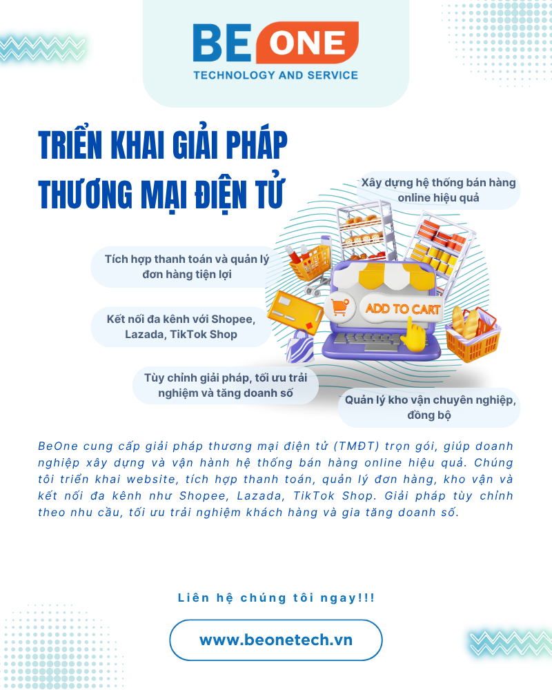 BeOne cung cấp giải pháp thương mại điện tử (TMĐT) trọn gói, giúp doanh nghiệp xây dựng và vận hành hệ thống bán hàng online hiệu quả. Chúng tôi triển khai website, tích hợp thanh toán, quản lý đơn hàng, kho vận và kết nối đa kênh như Shopee, Lazada, TikTok Shop. Giải pháp tùy chỉnh theo nhu cầu, tối ưu trải nghiệm khách hàng và gia tăng doanh số.