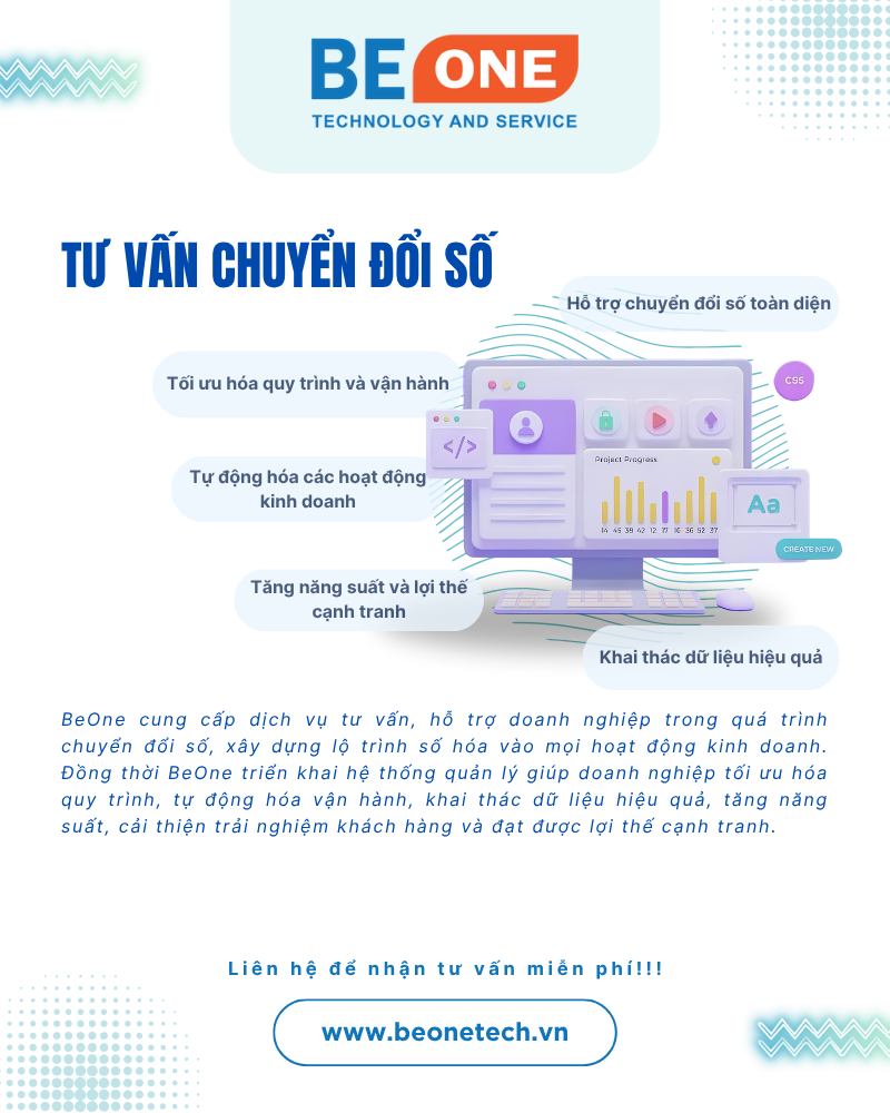 Beone cung cấp dịch vụ tư vấn, hỗ trợ doanh nghiệp trong quá trình chuyển đổi số, xây dựng lộ trình số hóa vào mọi hoạt động kinh doanh. Đồng thời Beone triển khai hệ thống quản lý giúp doanh nghiệp tối ưu hóa quy trình, tự động hóa vận hành, khai thác dữ liệu hiệu quả, tăng năng suất, cải thiện trải nghiệm khách hàng và đạt được lợi thế cạnh tranh.